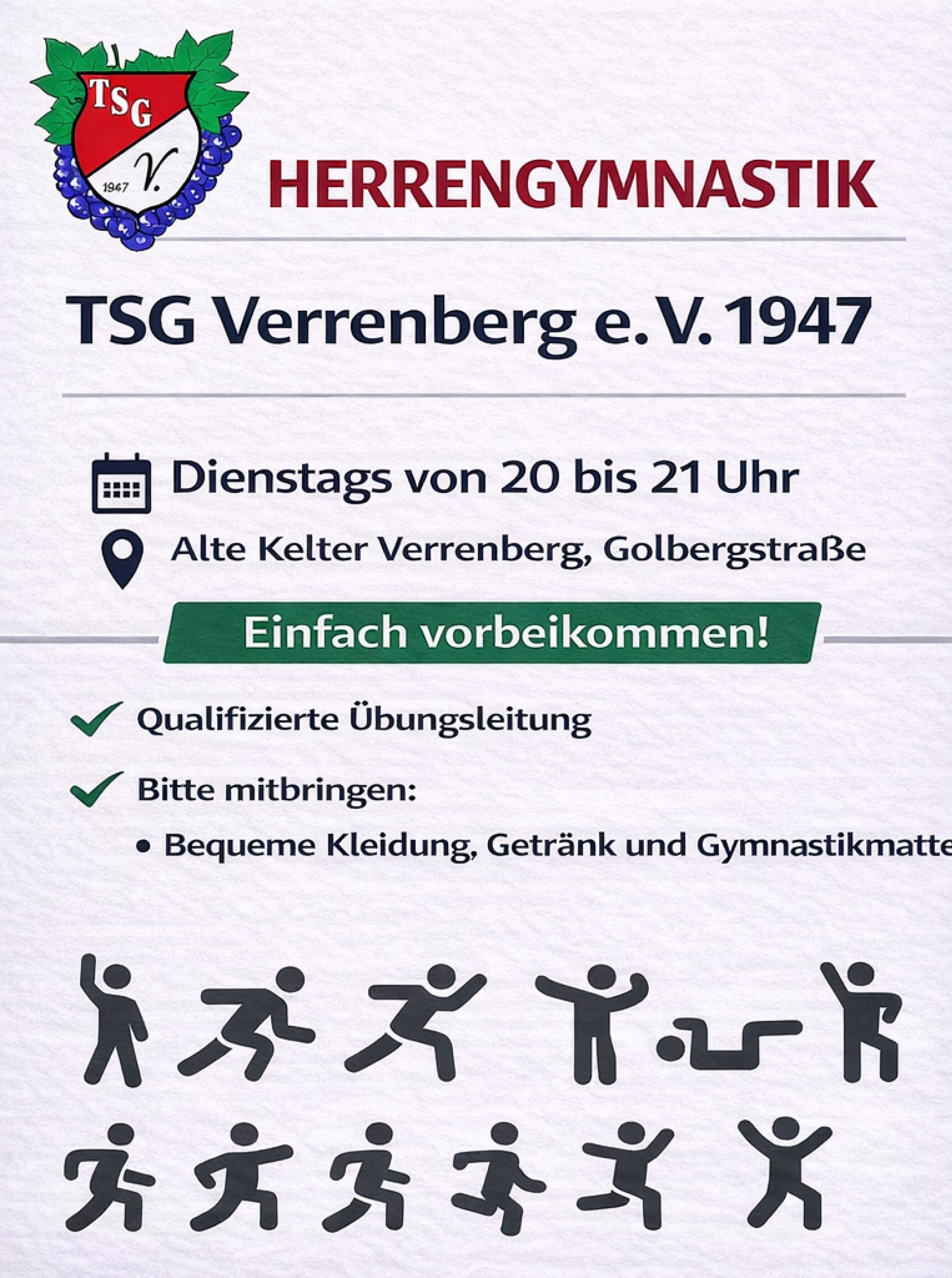 Das Trainingsprogramm der Herrengymnastikgruppe legt besonderen Wert auf schonende, aber effektive Übungen zur Stärkung von Rücken und Gelenken. Dabei werden moderne Fitness- und Bewegungskonzepte berücksichtigt, um die körperliche Fitness und Gesundheit nachhaltig zu verbessern. Zu den Schwerpunkten des Trainings zählen: