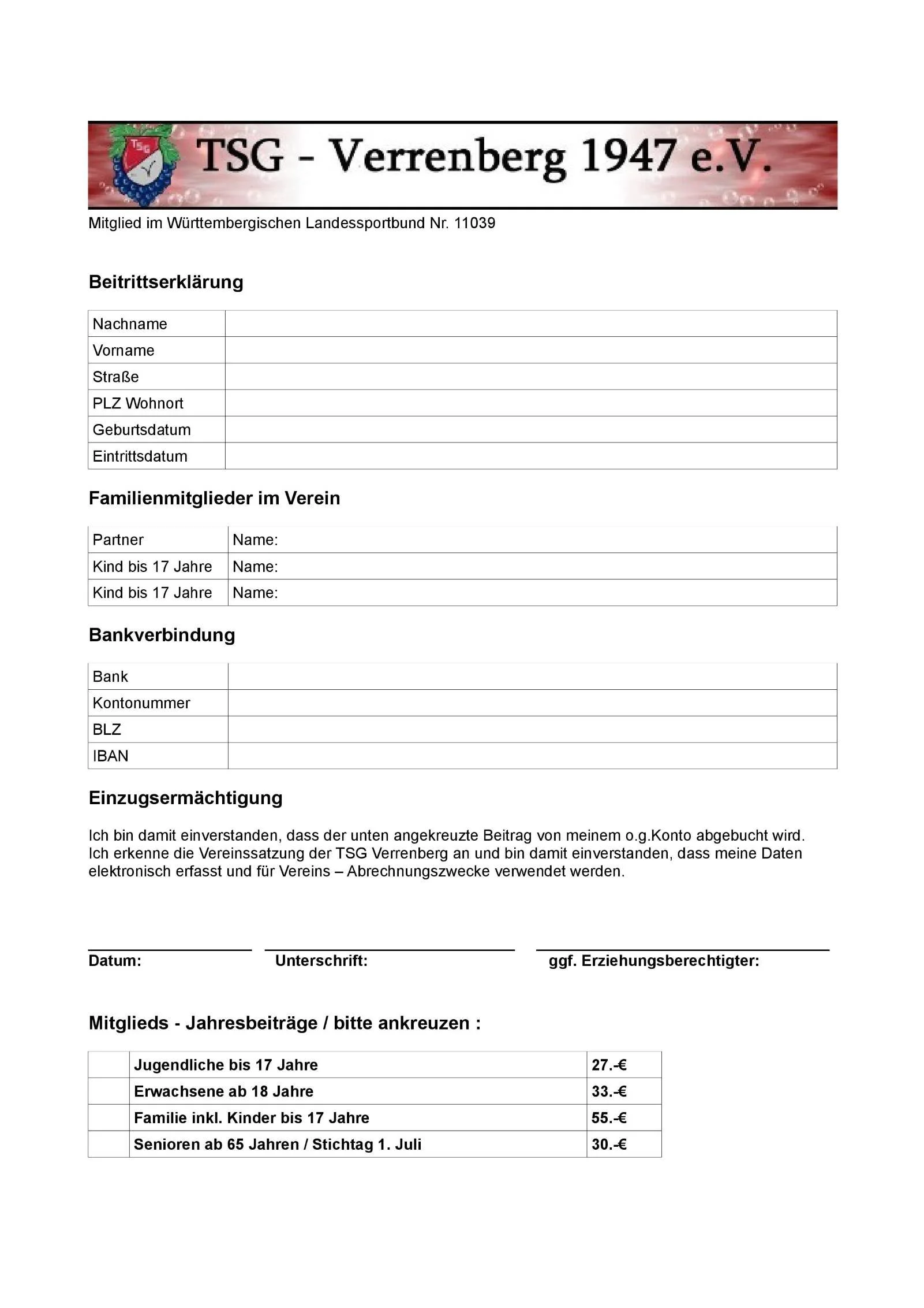 Werde Mitglied der TSG Verrenberg! Einfach das Formular ausfüllen und an uns weiterleiten! Wir freuen uns auf deine Unterstützung.